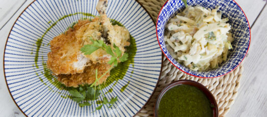Pečený mladý kohút, alebo kuriatko v panko strúhanke s thajským šalátom, mangom a pikantnou kapustou
