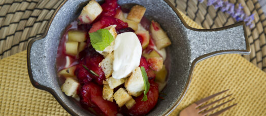 Jablkový kompót s nakladanými slivkami, syrom a karamelizovanými krutónmi