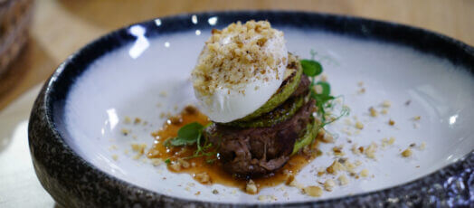 Hovězí svíčková s cuketou, ztraceným vejcem a ořechy