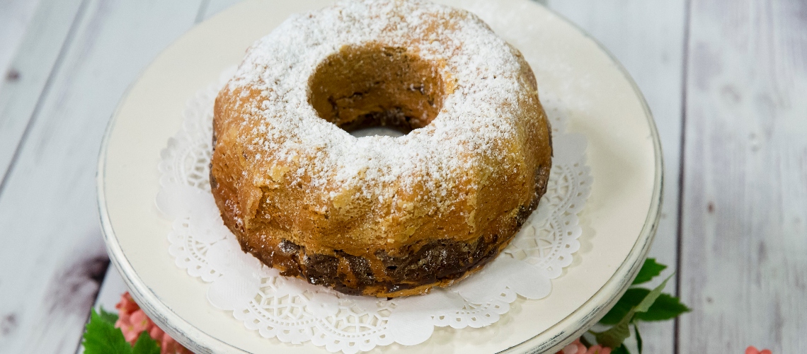 Polovicu zmesi nalejte do vymastenej a múkou vysypanej formy. Zvyšok cesta zmiešajte s kakaom a nalejte na vrch. Pečte 35 minút pri teplote 160 °C.