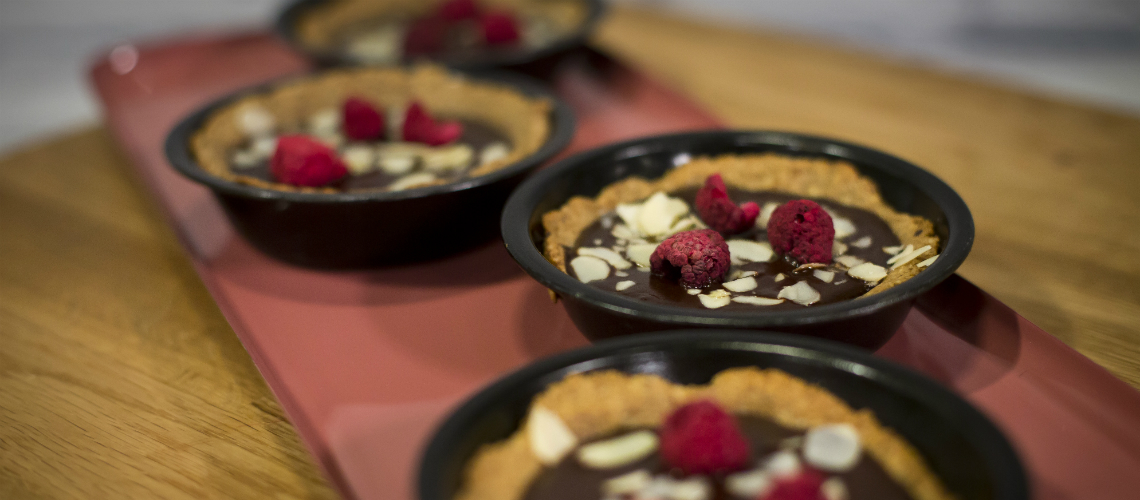 Vo vodnom kúpeli roztopíme maslo a šľahačku. Pridáme horkú čokoládu a kakao a na miernom ohni necháme dôkladne prepojiť na hladkú ganáž. Pripravenou čokoládovou plnkou plním naše upečené mandľové korpusy. Na záver posypeme mandľovými lupienkami a lyofilizovanými malinami.