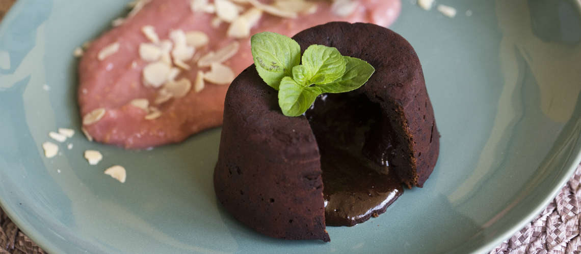 Vo vodnom kúpely necháme spojiť čokoládu a maslo. Do hmoty pridáme kakao, cukor, vajcia, žĺtky a metličkovým mixérom poriadne vyšľaháme. Na záver primiešame špaldovú múku. Hotovú zmes vylejeme do keramických formičiek, ktoré sme si vytreli maslom a vysypali kakaaom. Plníme asi 1cm pod okraj. Vložíme do predhriatej rúry a pečieme 7-8 minút pri 185 stupňoch. Keď je cesto po okrajoch tuhé a v strede mierne prepadnúté, treba koláčiky vypraď vod aby sa neprepiekli.