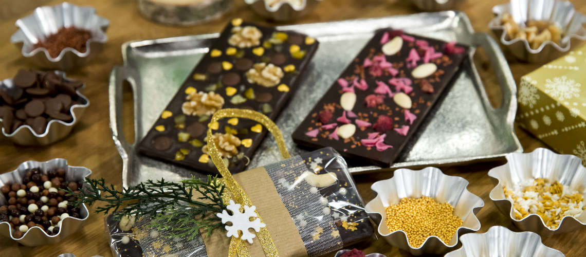Čokoládu temperujeme v poměru 2/3 a 1/3. Nalijeme do formy a posypeme libovolnými posypkami.