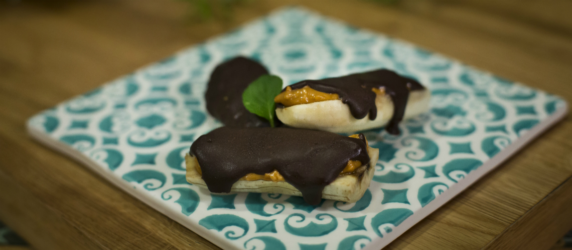 Banány rozrežeme na polovicu a ešte polovicu. Potrieme arašidovým maslom a čokoládovou polevou, ktorú si pripravými spojením masla, horkej čokolády a šľahačky.