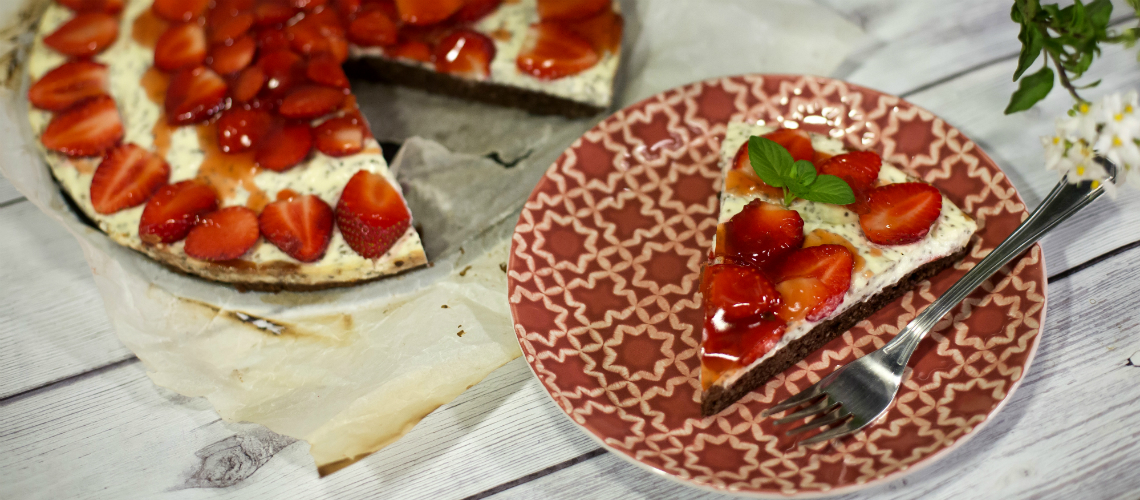 Ryžový cous cous, zalejeme vriacou vodou podľa návodu. Necháme pár minút nasiaknuť vodu a vychladnúť. Následne primiešame aj ostatné ingrediencie, čím získame vláčne cesto, ktoré vylejeme do tortovej formy a upečieme kým cesto nebude na povrchu tuhé. Pečieme približne 25 minúť pri 170 stupňoch. Na upečený korpus natrieme jahodový džem, potom vylejeme plnku a dáme ešte piecť na 5-10 minút.