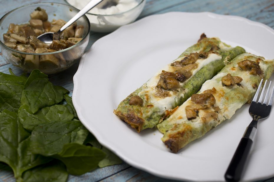 Připravíme si směs na palačinky, do které přidáme vařený špenát a vše rozmixujeme. Připravíme palačinky, naplníme je lesními hřiby, které jsme připravili jako pro bruschety. Posypeme strouhaným sýrem, srolujeme a potřeme smetanou. Na ni nasypeme několik nadrobno nakrájených hřibů a parmazán.