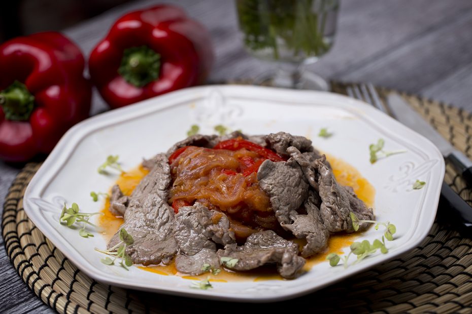 Cibuli opražíme, přidáme kousky červené papriky, rajčatovou omáčku a bazalku. Necháme asi 30 minut na mírném ohni. Maso nakrájíme na kousky, obalíme v mouce a na další pánvi je osmažíme. Zalijeme bílým vínem a podáváme na teplém paprikovém salátu.