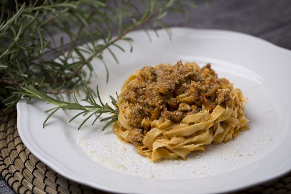Na pánev dáme cibuli a opražíme ji na olivovém oleji. Přidáme česnek a petrželku a ještě trochu opražíme. Přidáme mrkev a celer a ještě trochu opražíme. Přidáme vepřové maso a parmskou šunku. Pražíme 15 minut. Přilijeme trochu bílého vína. Jakmile se víno vypaří, přidáme rajčatovou omáčku a necháme ještě 20 min na mírném ohni.