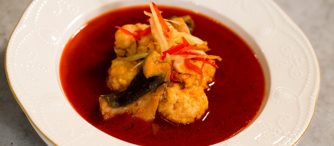 A másik filét hajszálvékony csíkokban beirdaljuk, majd ujjnyi vastag csíkokra vágjuk, és besózzuk. Ezt beletesszük az alaplébe.