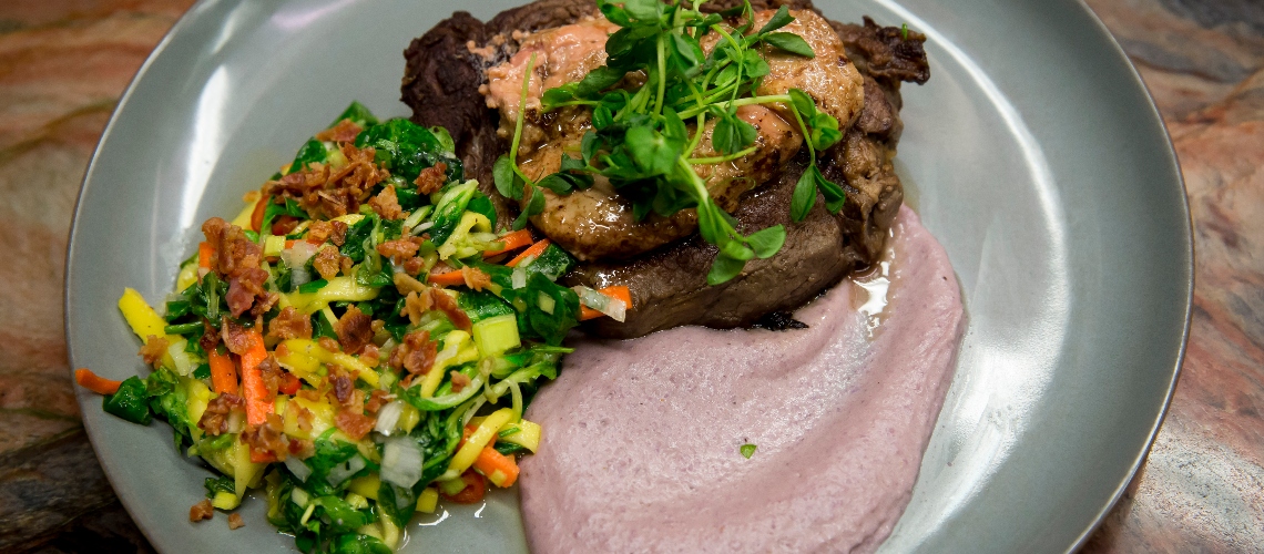 2 db közepes méretű szeletet vágunk, amit oldalanként 3 percig sütünk, olívaolajon, rozmaringgal, megtört fokhagymával, mellé kevés vajat teszünk. Fontos, hogy forró legyen a serpenyő, sercegjen, amikor beletesszük. Ezután sütőben 170 fokon 10-12 percig sütjük, majd kiszedjük és pihentetjük.