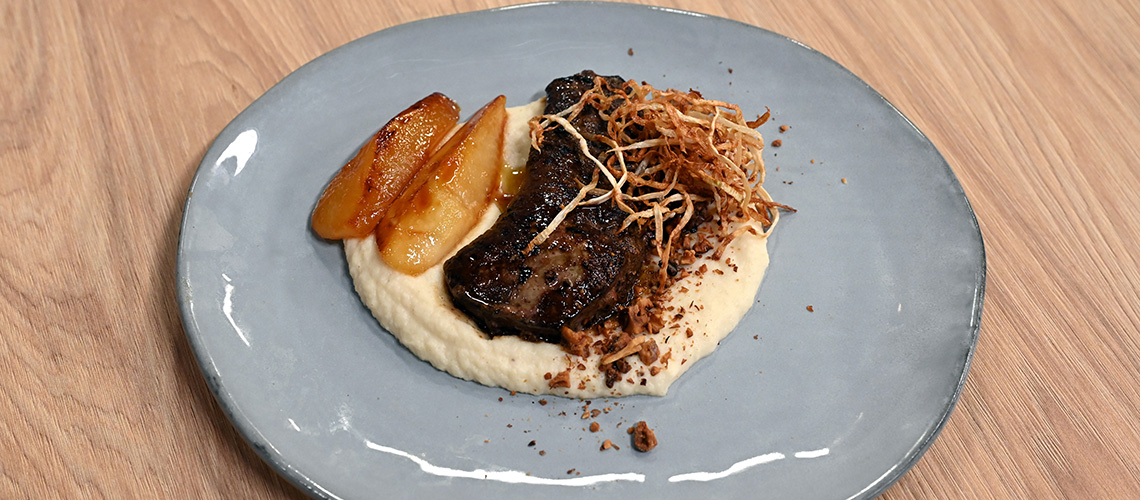 Szarvaspörkölt bográcsban főtt burgonyával és párolt paprikával