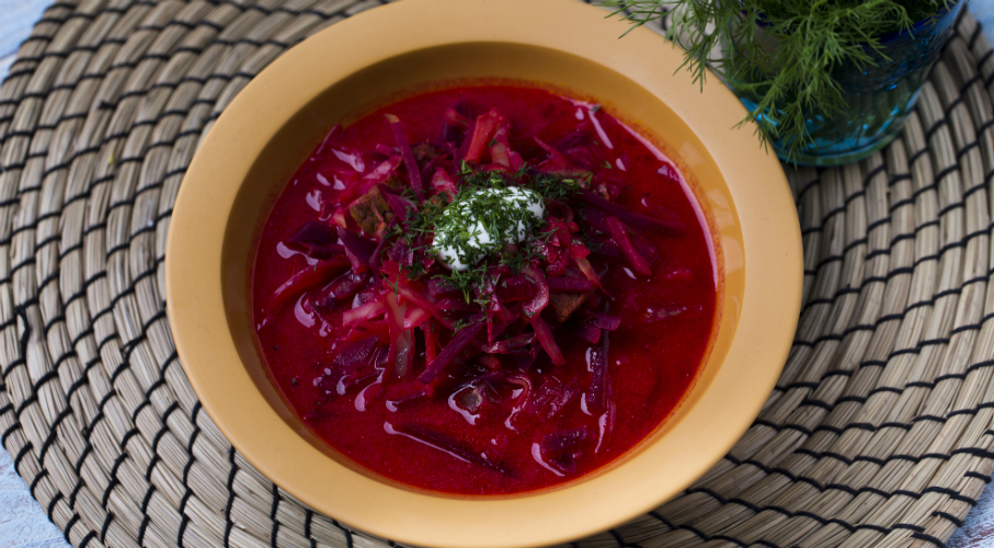 A húst és a csontot hideg vízben feltesszük főni. Hozzáadjuk a babérlevelet, néhány szem egész borsot, illetve sót. Egy másik edényben olajban megpirítjuk a vékony csíkokra vágott céklát, hozzáadjuk a paradicsompürét, citromlével és sóval ízesítjük. Puhára pároljuk. Egy lábasban olajban finomra vágott vöröshagymát pirítunk. Hozzáadjuk a csíkokra vágott sárgarépát, gyökeret, néhány percig pirítjuk, majd beletesszük a szintén csíkozott káposztát. Sózzuk, borsozzuk és őket is puhára pároljuk. Hozzákeverjük a párolt céklát lével együtt és a főtt, kockázott marhahúst. Felöntjük a hús főzőlevével és alaposan egybeforraljuk. Liszttel simára kevert tejföllel sűríthetjük és citromlével pikánsabbá tehetjük. Tálaláskor tejföllel locsolva, friss, vágott kaporral kínáljuk.