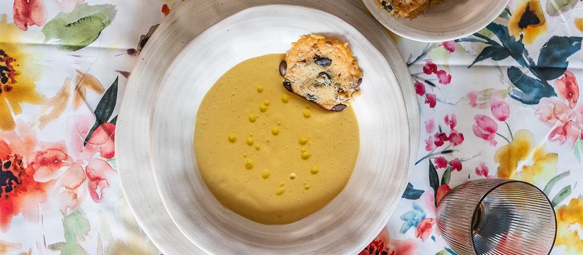 A levest tányérba szedjük és parmezán ropogóssal kínáljuk.