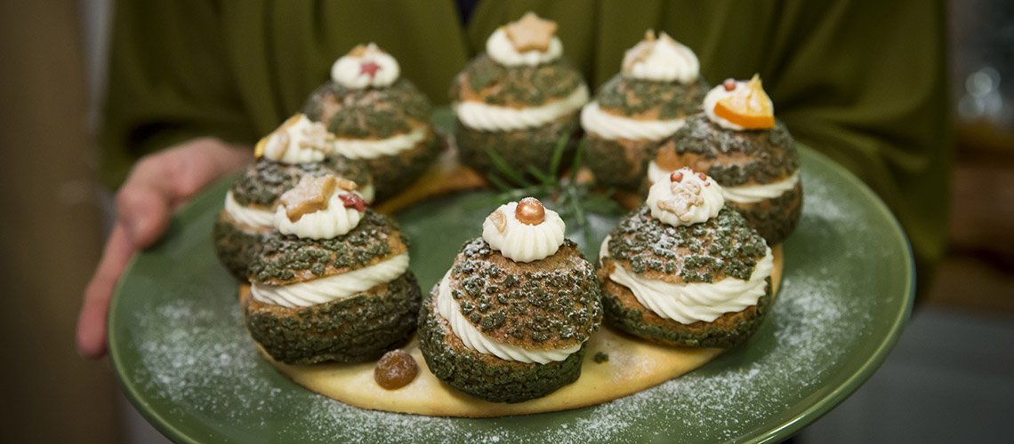 Összeállítás: Egy szép tortatálra rátesszük a linzer karikát. A ropogós tetős choux-at félbevágjuk vízszintesen. Először az almából teszünk mindegyik aljába egy kiskanálnyi adagot, aztán egy csillagcsöves habzsákból szép halmokat nyomunk a mogyorós krémből, majd sóskaramellel zárjuk a sort, végül rákerül a levágott „kalapja”. Annyi töltött francia fánkot teszünk az alapra, amennyi ráfér és ízlésesen néz ki. (ez kb. 8-9 fánk, mérettől függően)