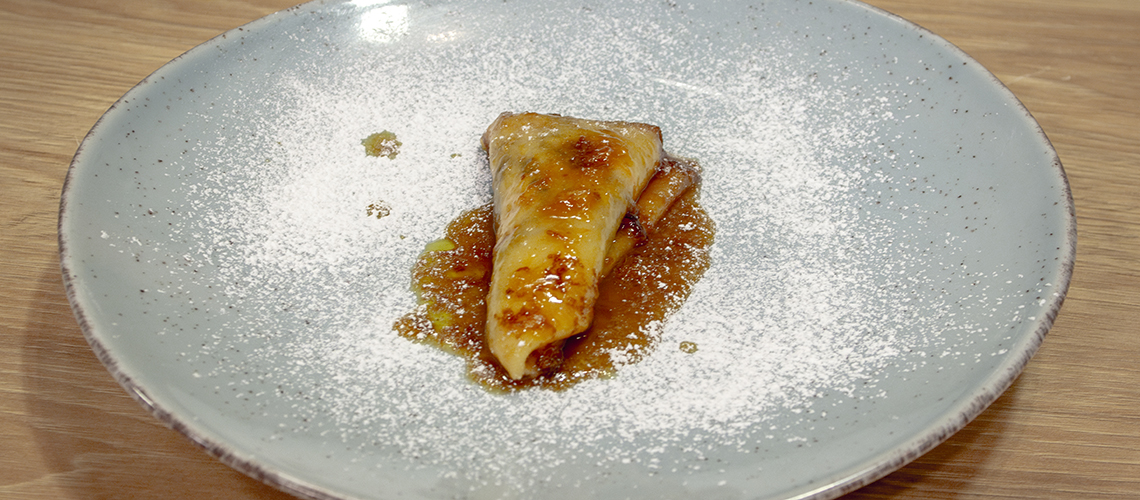 Amikor szirupos állagúvá válik, akkor fogjuk a palacsintáka egyesével és belemártjuk a szószba és levél formára hajtjuk. Amikor mind a 10 palacsinta benne van a serpenyőben, jöhet a flambírozás: ráöntjük a Grand Magnier-t a palacsintákra és meggyújtjuk. Szexi palacsintákat tálaljuk, porcukorral meghintjük.