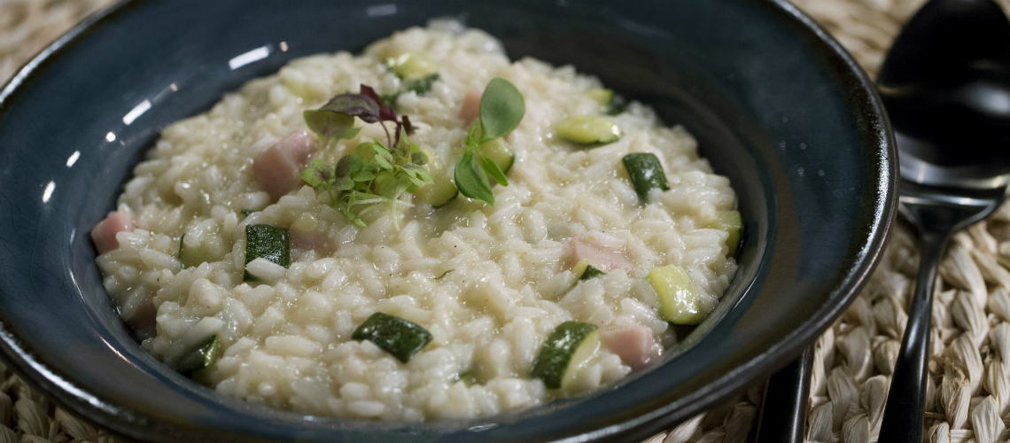 A kimagozott cukkinit felkockázzuk, és a sonkát is kockákra vágjuk. Olajat melegítünk, fokhagymát pirítunk, majd a cukkinit is megpirítjuk. Külön serpenyőben egy kevés vajon a sonkát is megpirítjuk. Az alaplevet felmelegítjük. Serpenyőben alacsony hőfokon az apróra vágott hagymát is megpároljuk, majd a fele mennyiségű bort hozzáadjuk. Hozzáadjuk a rizst, kicsit pirítjuk, majd a maradék bort is ráöntjük, valamint az alaplét hozzáadagoljuk, és 12 percig főzzük. Hozzáadjuk a cukkinit és a sonkát, sózzuk, borsozzuk és további 3 percig főzzük. Levesszük a tűzről, és mentát, valamint görög joghurtot és parmezánt adunk hozzá.