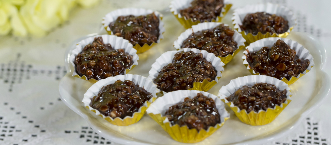Beleszórjuk a zabpelyhez és a diót, majd kis halmokat teszünk egy tepsire. Kihűtjük, legalább 2 órát.