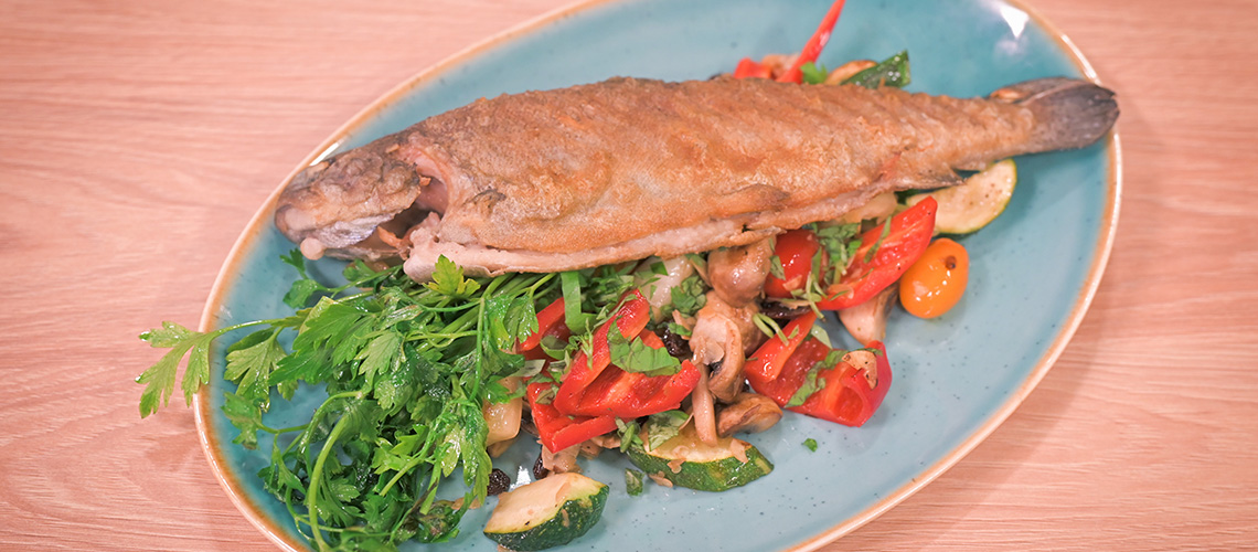 A pisztrángok hasüregét megtöltjük szeletelt fokhagymával és petrezselyemmel sózzuk, majd lisztbe forgatva kevés olajban néhány perc alatt pirosra sütjük. Közben a tetszőlegesen nagyobb darabokra vágott zöldségeket, egymás után kevés olajon hirtelen megsütjük és keverőtálba helyezzük. Még melegen locsoljuk balzsamecettel, olívaolajjal majd összeforgatjuk mazsolával, mandulával. Friss vágott bazsalikommal fűszerezzük.