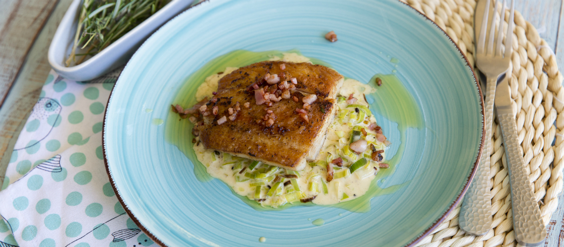 A szalonnakockákat lassan ropogósra sütjük, kivesszük, leitatjuk. Póréhagymát pirítunk, fűszerezzük és felöntjük kevés tejszínnel. A süllő bőrét lehúzzuk és a halat serpenyőben fokhagymával, fűszerekkel megsütjük, szalonnakockákkal és póréraguval tálaljuk.
