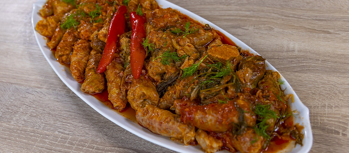 A töltelékhez az olajon megdinszteljük a hagymát, hozzáadjuk az apróra vágott paprikákat, majd a fűszerpaprikát, majd hagyjuk egy kicsit kihűlni. A tűzről levéve összekeverjük a késsel nagyon apróra vágott hússal, a rizzsel és a sűrített paradicsommal. Közben a káposzta fejeknek kivágjuk a közepét (torzsáját), és egészben forró vízbe merítjük néhány percre, míg a levelek megpuhulnak. Mikor kissé kihűltek, leveleire szedjük.