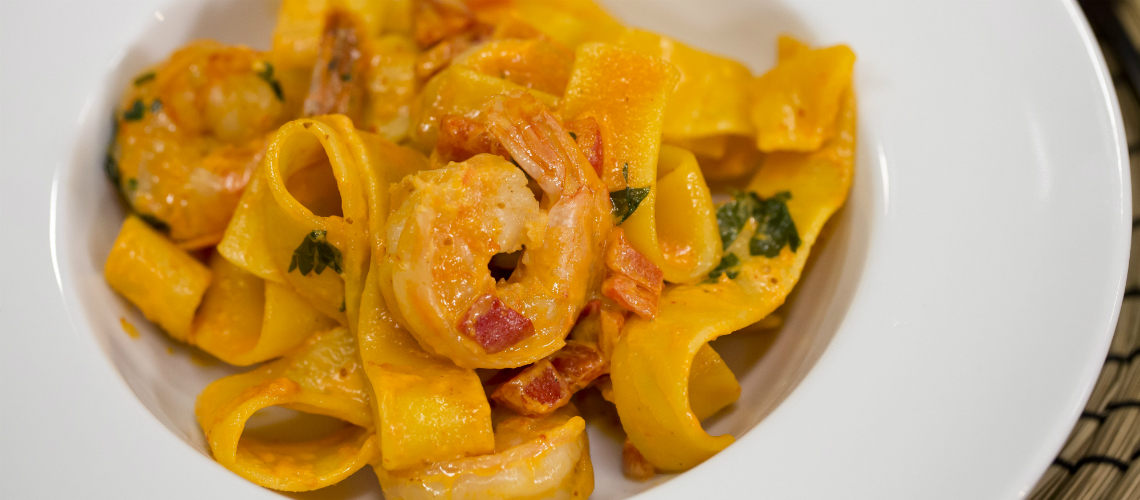 A pucolt rákokat olívaolajon, fokhgymával ízesítve, sóval petrezselyemzölddel és friss citromlével ízesítve 1 perc alatt készre pirítom. A rák egy részéhez pucolt, darabolt sültpaprikát adok, kevés harissán kanalazok bele, kevéske tejszínnel összerottyantom és frissen főtt papardellével összekeverve. Frissen vágott bazsalikommal megszórva kínálom.