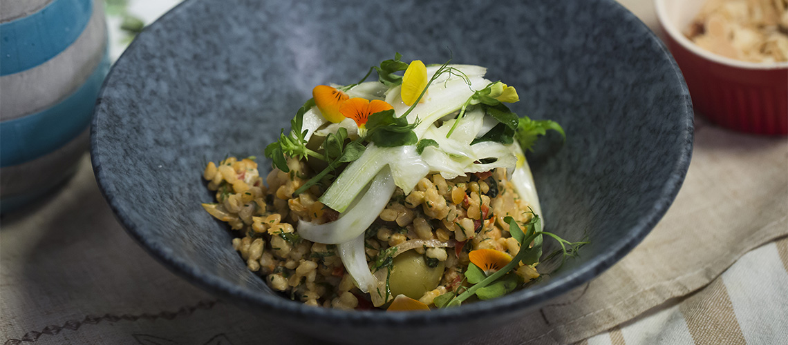 A gerslit vízben megfőzzük, lecsepegtetjük, a salottát feldaraboljuk, megpirítjuk, hozzáadjuk az olívabogyót, a paprikát és az előfőzött lencsét, sóval, borssal, zaatarral ízesítjük. Adjuk hozzá a lime levét, az olívaolajat, a joghurtot és keverjük össze. Keverjük be a humuszt, a fűszernövényeket és végül a gerslit, majd óvatosan keverjük össze. Édeskömény szeletekkel kínáljuk.