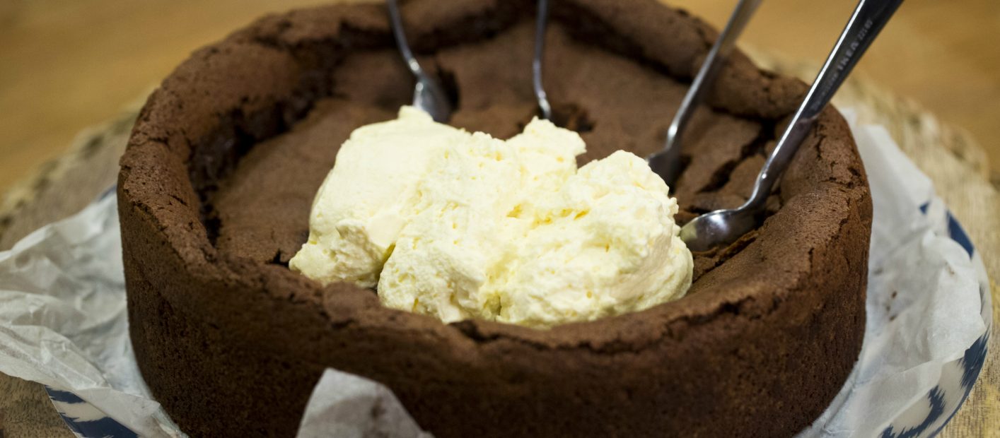 A csokoládét és a vajat vízgőz felett óvatosan felmelegítjük ügyelve, hogy a csokoládé ne essen szét.