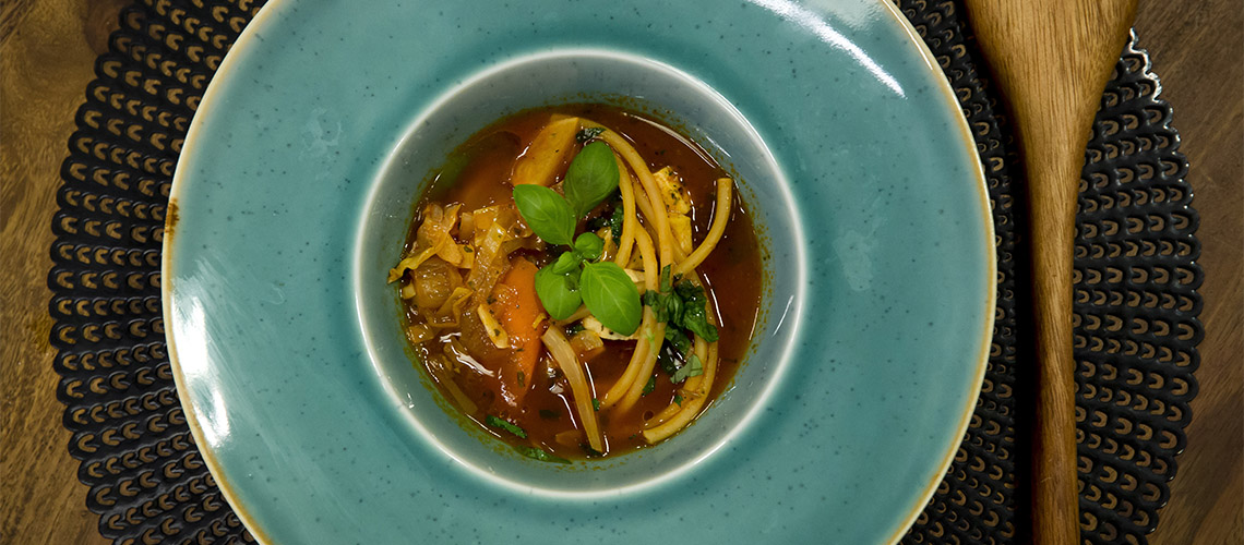 A tésztát sós vízben megfőzzük. Az olajon megpirítjuk a hagymát, fokhagymát, burgonyát, majd hozzáadjuk az apróra vágott gyökérzöldségeket. Fűszerezzük, majd ráöntjük a paradicsompürét és az alaplét. Összeforraljuk és a sűrített paradicsomot is belekeverjük. Amikor a zöldségek megpuhultak, tésztával tálaljuk.