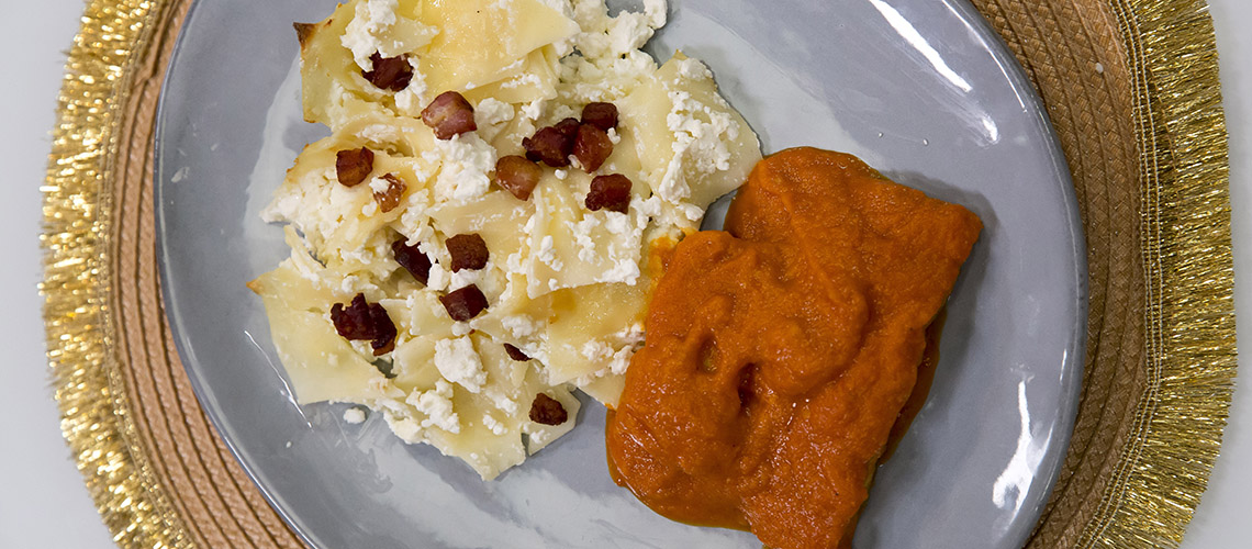 Amikor elkészült kis tejföllel összemixeljük az egészet, a harcsaszelet, vagy kockákra halmozzuk. Mellé a csusza tésztát megfőzzük. A kolozsvári szalonnából kockákat vágunk és lepirítjuk, majd a tésztát elkeverjük a tejföllel és a túróval és ráöntjük a kolozsvári kockákat.