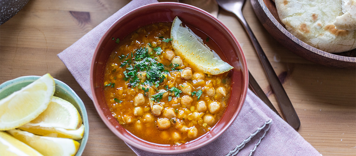 A hagymát apróra vágjuk, a zellert nagylyukú reszelőn lereszeljük, a fokhagymákat összetörjük, majd mindhármat az olajon megfonnyasztjuk. Ha összeestek, rádobjuk az összes fűszert és 1 percig pirítjuk az egészet, amíg illatozni kezd. Hozzáadjuk a passzírozott paradicsomot és újabb 1 percig rotyogtatjuk. Hozzáadjuk az átmosott lencsét és a zöldségalaplét. Felforraljuk, majd közepes lángon addig főzzük, amíg a lencse megpuhul – kb. 35-40 perc. Közben a csicseriborsót lecsöpögtetjük. Ha a lencse megpuhult, hozzáadjuk a leveshez a csicseriborsót és az apróra vágott petrezselymet. Az egészet átforrósítjuk. Citromgerezdekkel és frissen sült (vagy átsütött) pitával tálaljuk.