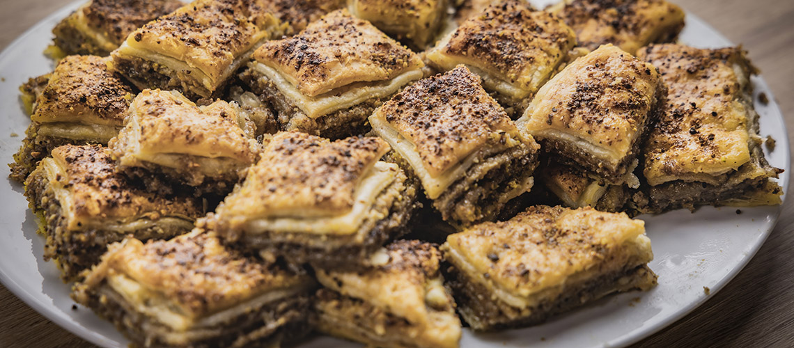 Egy kisebb edényben kb fél liter vizet teszünk a tűzre, és beleöntjük 20-25 dkg cukrot és szirupot készítünk belőle. Közben egy serpenyőben pisztáciát pirítunk. Egy tepsibe rétestésztát helyezünk, majd megkenegetjük olvasztott vajjal. Mikor a pisztácia megpirult kicsit félretesszük hűlni, majd ledaráljuk. Egy meglisztezett deszkán rányújtunk a készen vásárolt rétestésztára, kis élesztőt is tehetünk a liszthez, hogy még szebb legyen az eredmény. Az első réteget elhelyezzük a tepsiben, vajazzuk, és csinálhatunk kétfélét is, úgy, hogy a tészta egyik felére ráhalmozzuk a darált pisztáciát és a tészta másik felére a darált diót. Egy adag pisztáciát félreteszünk, hogy majd a tetejére is tudjunk szórni. A darált magok tetejét meghintjük sima- és vaníliás cukorral és fahéjjal. Újból megvajazzuk az olvasztott vajjal, hogy a következő tészta réteg alá is kerüljön. Majd az egész műveletsort újrakezdjük, a tésztát úgy is vajazhatjuk, hogy a tepsi tetejére tesszük a sodrófára tekert tésztát, és ahogy görgetjük le a sodrófáról, úgy vajazzuk közben a tésztát. A tetejét is megvajazzuk, megszórjuk a maradék pisztáciával és 180 fokos sütőben kb 25 perc alatt készre sütjük. Ahogy a sütőből kivettük meglocsoljuk a sziruppal.