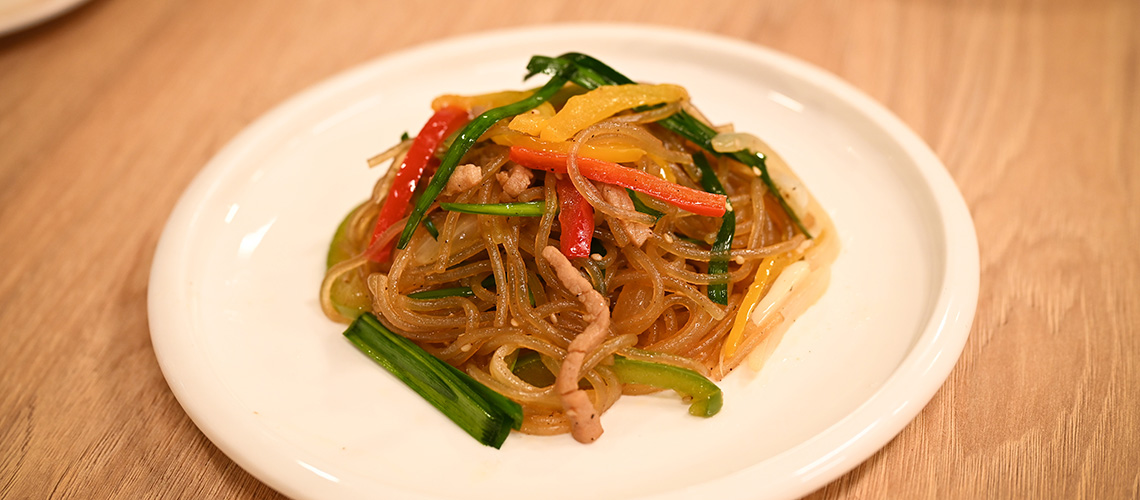 A húst vékonyan felszeleteljük. Elkészítjük a páclevet és bepácoljuk a húst. Lefedve félretesszük. A zöldségeket külön-külön megdinszteljük. A tésztát folyamatosan ellenőrizve kifőzzük. Amikor még kissé kemény a közepe, leszűrjük és alaposan átmossuk hideg vízzel. A tészát egy nagy keverőtálba tesszük, majd hozzákeverjük az előkészített zöldségeket. A tésztához elkészítjük a szószt és ezt kevergetés mellett a tésztához forgatjuk. Tálra szedve szezámmaggal enyhén megszórva tálaljuk.