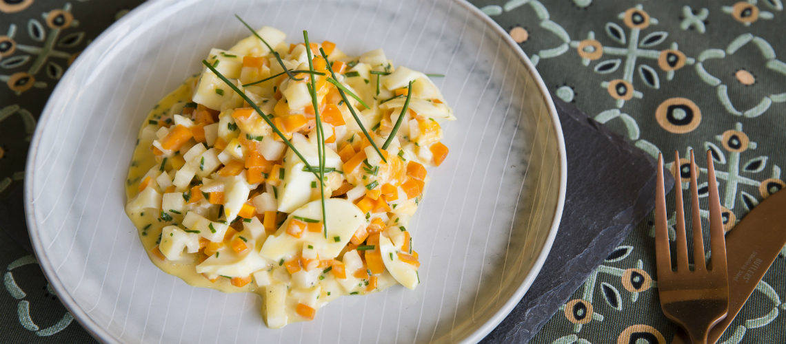 A főtt tojást és a zöldségeket összekeverjük, majonézzel és a többi összetevőkkel ízesítjük.