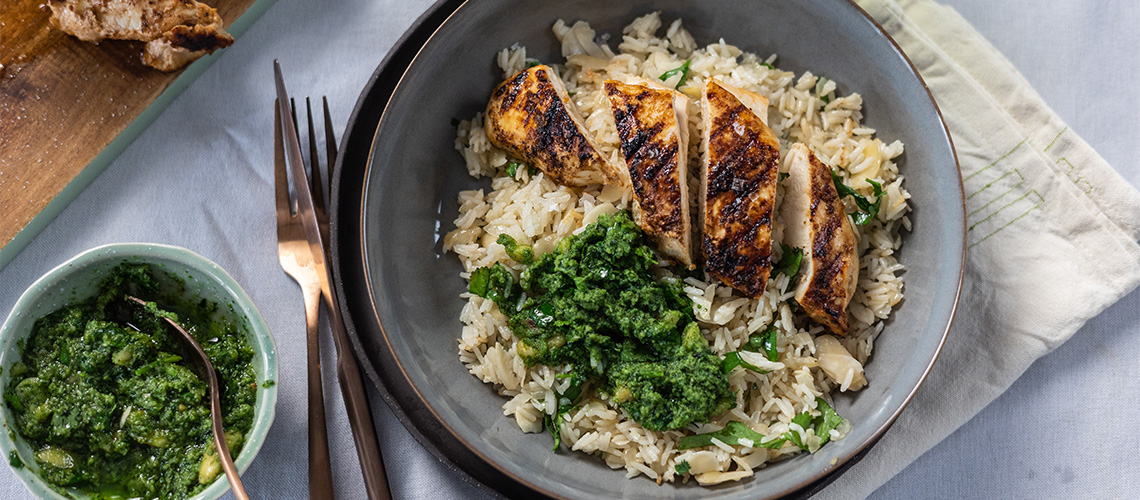 A hússzeleteket grillen vagy grillserpenyőben mindjét oldalukon pirosra sütjük, felszeleteljük és a rizzsel és a pesztóval tálaljuk.