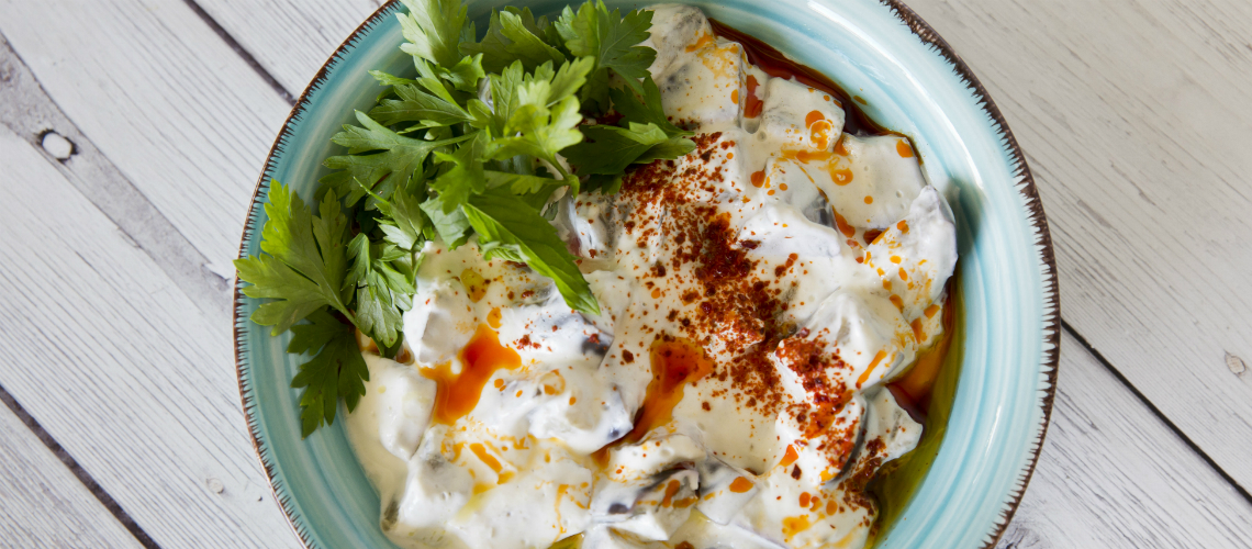 Előkészítjük a padlizsánt: kb. 3 cm-es kockákra vágjuk, jénaiba vagy fóliával bélelt tepsire tesszük, besózzuk 3 evőkanál sóval, majd egy órát állni hagyjuk. A padlizsánt leöblítjük, kinyomkodjuk, konyhai törlőpapírral alaposan megszárítjuk. A padlizsánkockákat vízben is megfőzhetjük, de hagyományosan egy nagy serpenyőben felhevítjük az olajat, és megsütjük benne a padlizsánkockákat. Nagyon sok olajat vesz fel, ha szükséges, adhatunk még hozzá. Ez a mennyiségű padlizsán nem fér be egy adagban a serpenyőbe, tehát több adagban kell sütni. Kiszedjük egy tálra és lehűtjük. A sűrű török vagy görög joghurtot összekeverjük a sóval és a reszelt fokhagymával. Ha éppen nincs otthon török, vagy görög típusú joghurt, a sima natúr joghurtot egy szűrőbe öntjük, majd két órán át hagyjuk lecsepegni. A joghurtot csak közvetlenül tálalás előtt keverjük össze a sült padlizsánnal, különben megbarnul. Az étel tetejét megszórjuk finomra aprított petrezselyemmel.