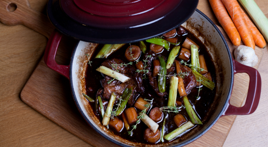 A kacsacombot kicsontozzuk, megszórjuk sóval, borssal és liszttel. Egy nagy edényben bőrrel lefelé megpirítjuk, hogy kiengedje a zsírját. A másik oldalán is megpirítjuk. Kitesszük egy tányérra, és ugyanabban a lábosban a kacsa zsírján megpirítjuk a fehérrépát. Visszatesszük a kacsát, felöntjük vörösborral és addig pároljuk, míg a bor 1/3-a elforr. Hozáadjuk a borecetet, alaplevet, sózzuk, borsozzuk majd lefedjük. 160 fokon 90 percig sütjük. A sütés vége előtt 10 perccel hozzáadjuk a félbe vágott újhagymát.