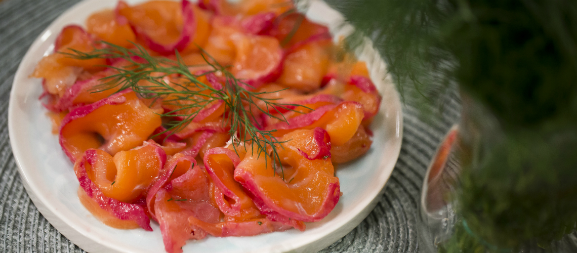 A sót keverjük össze a cukorral. A filét szálkázzuk ki, a felesleges zsírréteget vágjuk le. Tegyük egy akkora tepsibe vagy egy jénai tálba, amiben kényelmesen elfér. Reszeljük rá a céklát, terítsük el a hal egész felületén, reszeljük rá a citrusok héját is, majd szórjuk meg a finomra aprított kaporral. Facsarjuk rá a citrusok levét, majd borítsuk rá a sós-cukros keveréket. Fedjük le, 4-5 órára tegyük hűtőbe. Mossuk le róla a fedőréteget, törljük szárazra, majd egy éles kés segítségével vágjunk vékony szeleteket. A tejszínt verjük habbá, forgassuk hozzá az enyhén kinyomkodott tormát. Sózzuk. A lazac mellé kínáljuk.