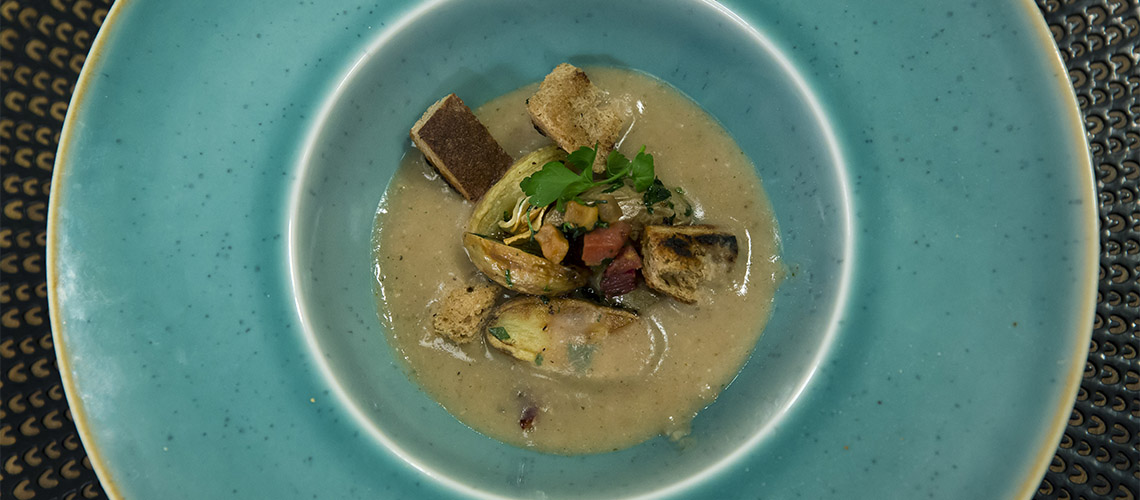 Vágjuk ki a kenyér közepét. Megpirítjuk és krutont készítünk. Az alaplét felmelegítjük, adjuk hozzá a reszelt fokhagymát, a finomra vágott kenyeret, ízesítsük majoránnával, sózzuk, borsozzuk. A burgonyát sós vízben megfőzzük, a szalonnát megpirítjuk. Miután a kenyeret alaposan belefőztük, botmixerrel összeturmixoljuk. Burgonyával, sült szalonnával, petrezselyemzölddel és friss fokhagymával tálaljuk.
