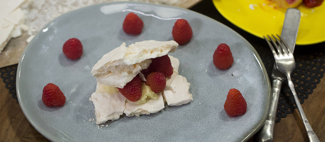 A tepsit kibéleljük, a sütőt 110 fokra előmelegítjük. A tojásfehérjét közeles sebességen felverjük. Ezután nagyobb sebességen folytatjuk, hozzáadjuk az egy evőkanál kristálycukrot. Kemény és fényes állagúra verjük. Szitáljuk át a porcukrot egy szitán, és óvatosan, szakaszosan a keverékbe. A tespire formázzuk, majd körülbelül másfél óráig sütjük légkeveréses sütőben. Hagyjuk megszáradni és kihűlni. A vajból, cukorból és kókuszból krémet keverünk, amivel a meringlapokat összetapasztjuk. A Málnát coulis-vá főzzük és díszítésre használjuk föl.