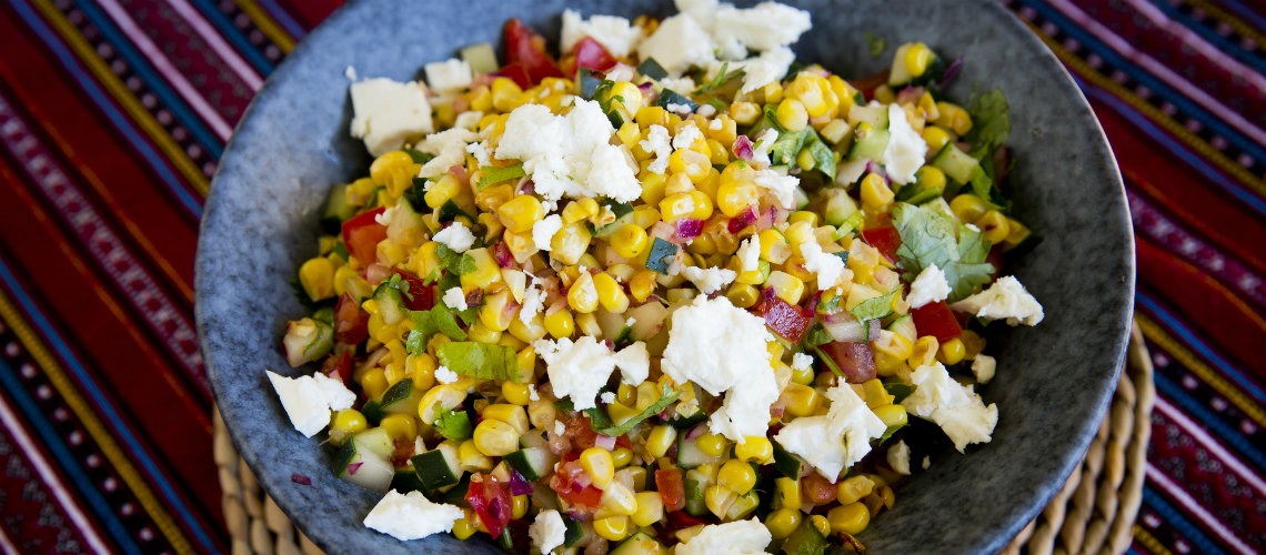 A kukoricát éles késsel egy magasfalú, mély tálban leszemezzük (a mély tál azért praktikus, mert a kukoricaszemek “repkednek” össze-vissza). Forrásban lévő, sós vízben, kb. 1 percig főzzük, éppen csak annyira, hogy elveszítse nyersességét, de zsenge, puha maradjon. Leszűrjük, és lehetőség szerint lehűtjük (ennek legegyszerűbb módja, ha a mosogatóba jeget teszünk, és ebbe állítunk egy üvegtálat a kukoricával). Közben kiskanállal eltávolítjuk az uborka magját (meghámozni nem szükséges), és felkockázzuk. Felaprítjuk a lilahagymát és felszeleteljük a paradicsomot. Az öntethez (amelyet abban a tálban keverhetünk, amelybe a saláta kerül) összekeverjük a citrom és zöldcitrom kifacsart levét a chilipasztával és a szójaszósszal. Összekeverjük a zöldségekkel és a korianderrel, majd kb. egy órára a hűtőbe tesszük, hogy összeérjenek az ízek. Grillezett húsok mellé például kitűnő.