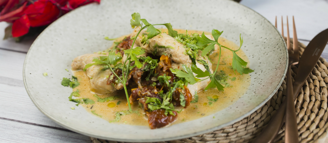 Tisztítsuk meg a csirkemelleket, és pirítsuk meg serpenyőben fokhagymával. Öntsük föl alaplével, adjunk hozzá paradicsomot, kakukkfüvet és süssük 180 fokon 10-15 percig. Vegyük ki a csirkemelleket a sütőből, tegyük meleg helyre. A szaftot redukáljuk a felére, adjuk hozzá a maradék paradicsomot, a fekete borsot, sózzuk és a lime-ot facsarjuk bele.