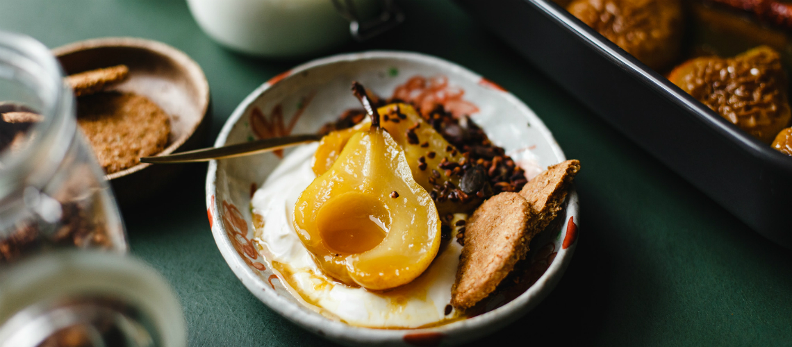 A körtéket agy hőálló tálba tesszük vágott oldalukkal lefelé, majd meglocsoljuk cukros narancslével. Mellé dobjuk a fahéjrudat és a narancshéjat. 190 fokra előmelegített sütőben addig sütjük, amíg a körték teljesen megpuhulnak (kb. 1 óra). Közben néhányszor meglocsoljuk a narancslével. A sütés közben a narancslé sziruposra sűrűsödik.