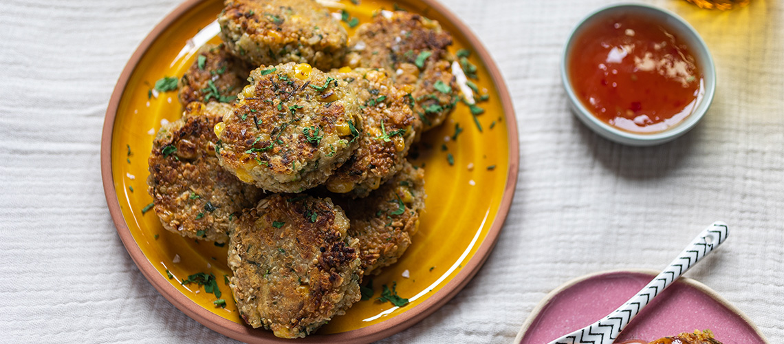 Egy nagy keverőtálba szedjük a quinoát, zabpelyhet, tojást, kukoricát, a lereszelt sajtot, a fnomra aprított zöldfűszereket, chilit, sót, borsot. Alaposan összedolgozzuk és hagyjuk 30 percet állni, hogy a zabpehely megduzzadjon.