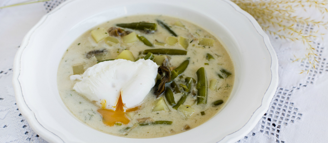 A szárított vargányát legalább 30 percre beáztatjuk a forró vízbe. Ha hozzájutunk friss erdei gombához, azzal természetesen még finomabb, értelemszerűen azt nem áztatjuk. A vajon, fedő alatt, csipet sóval meghintve, üvegesre pároljuk a felszeletelt újhagymát. Felöntjük a leszűrt húslevessel, a szárított gomba vizével és a tejjel. Hozzáadjuk a babérlevelet, az egyenletes méretűre felkockázott burgonyát, a gombát és a zöldbabot. Sózzuk, borsozzuk. Kb. 12-15 percig főzzük, amíg a burgonya megpuhul. A tejfölt csomómentesre keverjük az étkezési keményítővel, néhány kanál forró levet adunk hozzá, majd a levesbe keverjük. Hozzáadjuk az ecetet és a csipet cukrot, végül a finomra aprított kaprot. A buggyantott tojáshoz egy nagy lábasban vizet forralunk. Amikor forr, egy evőkanál ecetet adunk hozzá. A tojásokat egyesével feltörjük, és egy-egy csészébe, vagy kis tálkába helyezzük. A vizet kanállal határozott, körkörös mozdulatokkal megkeverjük és az örvénylő vízbe csúsztatjuk a tojásokat. 3 percig főzzük, amíg a fehérje megszilárdul, de a sárgája lágy. Szűrőkanállal kivesszük, és hideg vízbe helyezzük (vagy azonnal a levesbe). Egyesével könnyebb elkészíteni. A tojást közvetlenül a levesbe is üthetjük, ez esetben a végeredmény kevésbé látványos.