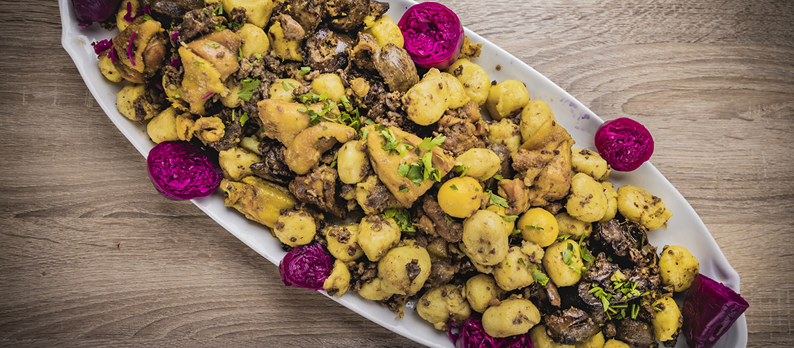 Egy forró lábosba kacsaháj darabokat vágunk, majd a tyúk darabolt részeit a máj kivételével rátesszük. Kacsazúzát is teszünk a tyúk mellé. Sózzuk, és annyi vizet teszünk, amennyi ellepi a húsokat. Elkezdjük fedő alatt sütni. Pár perccel azelőtt, hogy készre sülnek a húsok és a zúza is megpuhult a májat is beletesszük a fazékba. A gombócokhoz egy tál főtt krumlipt összetörünk, hozzákeverünk vajat, megvárjuk míg kihűl kicsit, mert különben nem csak megégeti a kezünk, hanem sok lisztet is felvenne. Majd kitesszük egy lisztezett deszkára, és hozzákeverünk lisztet, sót és egy tojást. Meggyúrjuk a tésztát, és mikor kész gombócokat formálunk belőle. A májat kés hegyével megtépkedjük. A készre sült húsokat kivesszük a fazékból, és az alján levő zsírban megsütjük a tépett májat. Közben a gombócokat forró vízben megfőzzük, majd a sült zsíros májas lábosban megforgatjuk őket. Mikor ez megvan, a húsokat is még visszatesszük pár percre, és összekeverjük az egészet, majd tálaljuk.