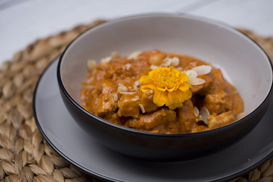 A csirkehúst kockákra vágjuk, és mandulapehelybe forgatjuk, majd olívaolajban kisütjük. Meglocsoljuk fehérborral, és amikor az teljesen elpárolgott, teszünk bele 4 evőkanál tejfölt. Megszórjuk fűszerpaprikával.