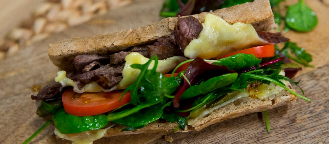 Vágjuk a húst vékony szeletekre. Keverjük össze a majonézt szemes mustárral és mézzel. Pirítsuk meg a bagettet, töltsük meg hússal és süssük pár percig sajttal borítva 220 fokon. Ezután öntetet, paradicsomot és salátát és savanyú uborkát tálalunk bele.