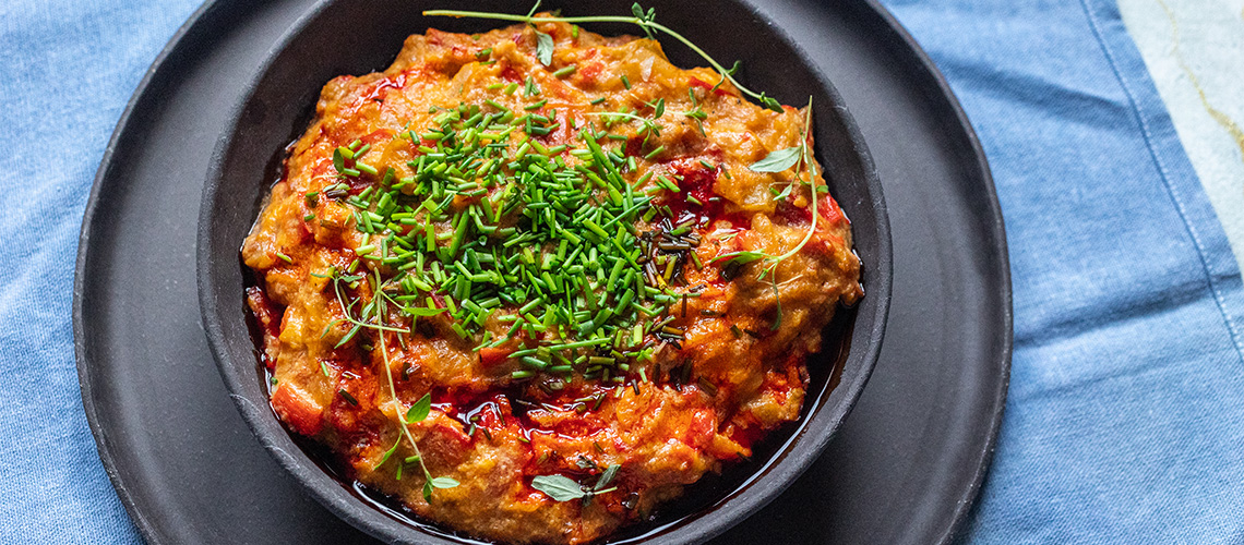 Egy nagy serpenyőben felhevítjük az olajat és a hagymát a feldarabolt paprikákkal édesre sütjük benne. Hozzáadjuk a pardicsomkonzervet, sózzuk, borsozzuk és adunk hozzá szárított kakukkfüvet is. 5-7 percig rotyogtatjuk, közben felverjük a tojásokat. Amikor a paradicsomos szósz besűrűsödött, hozzácsorgatjuk a tojásokat és egészen alacsony lángon, folyamatosan kevergetve készre főzzük az ételt. Akkor jó, ha krémes, sűrű és szaftos. Nem szabad kiszárítani! Tálaláskor egy kevés metélőhagymával megszórhatjuk. Forrón fogyasszuk!