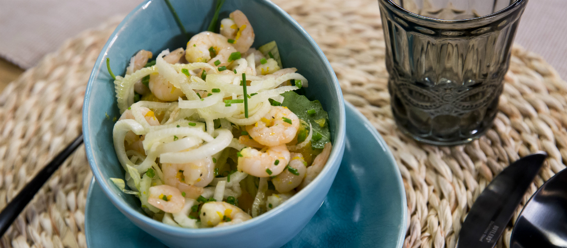 Feltesszük a vizet a babérlevéllel, petrezselyemmel, fokhagymával és fehérborral. Pár perc alatt készre főzzük a garnélákat. Lereszeljük egy narancs héját, meghámozzuk és filézzük. Felszeljük az édesköményt és jeges vízbe tesszük. A vegyes salátával és az édesköménnyel összeforgatjuk a rákokat. Snidlinget aprítunk. Vinaigrette-et készítünk. Salátástálba halmozzuk a salátát és meglocsoljuk a dresszinggel.