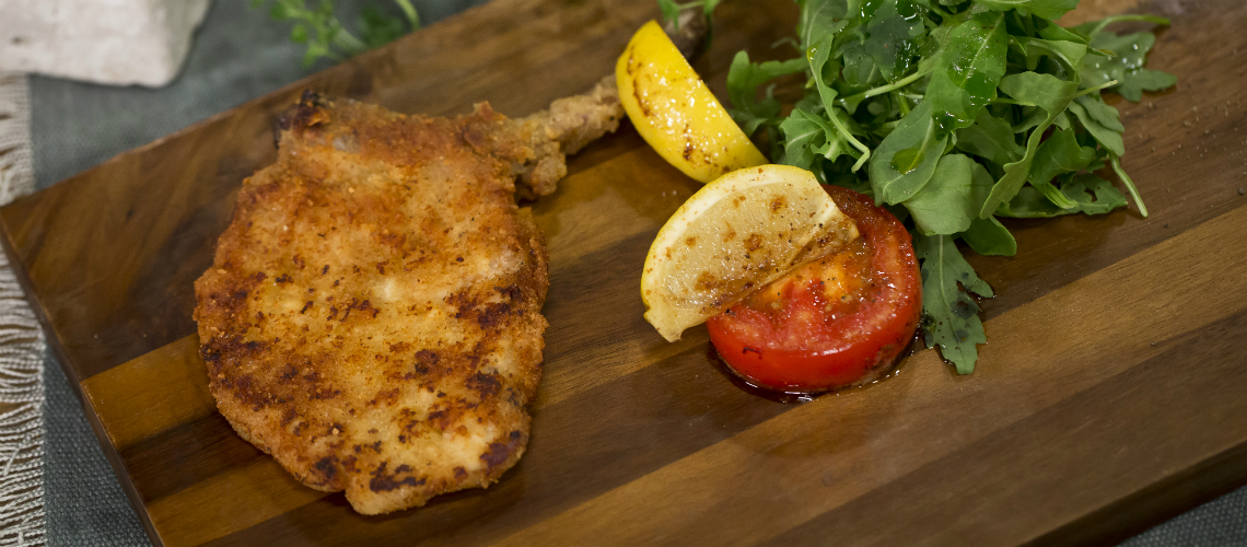 A csontosra hagyott sertéskarajt megtisztítom, lehártyázom, majd tojásba és parmezán sajttal kevert zsemlemorzsába forgatom. Kevés olívaolaj és olvasztott vaj keverékében ropogósra sütöm.